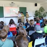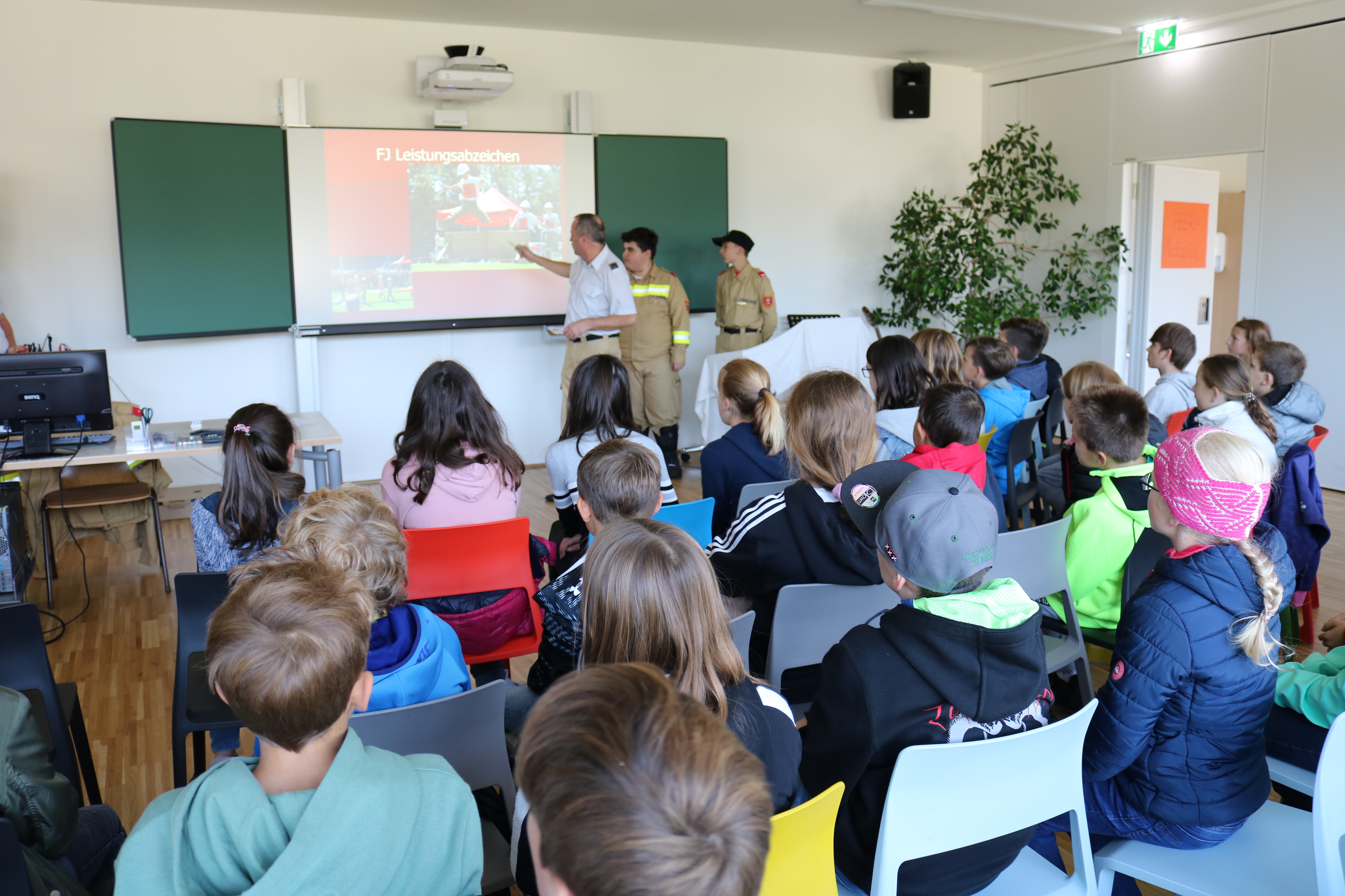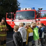 Zu guter Letzt durften die Kinder theoretisches Wissen über eine Präsentation erfahren. Hier gab es Erklärungen über die Leistungsabzeichen, Übungen, Einsätze sowie das Gemeinschaftsleben innerhalb einer Feuerwehr. Daneben gab es als Hauptattraktion die Möglichkeit mit einer Drehleiter zu fahren oder ein paar Sprünge in der Hüpfburg vor der Schule zu machen.