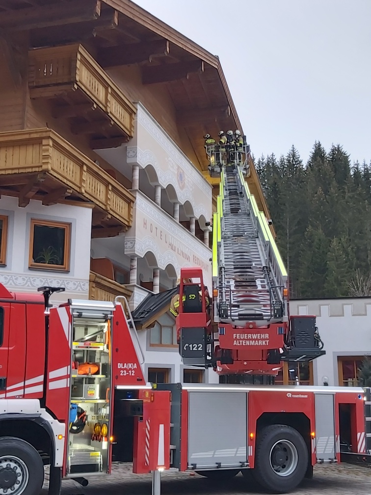 Auch die Filzmooser Feuerwehrleute waren bei den zwei Übungen, die einmal am Dorfplatz und einmal beim Alpenhof Filzmoos stattfanden, begeistert von der neuen Drehleiter. Der Feuerwehrkommandant der Feuerwehr Altenmarkt, OFK HBI Georg Weiß, erläuterte die wichtigsten technischen Funktionsweisen und erklärte mögliche Einsatzgebiete. Die Drehleiter bietet mit einer maximalen Arbeitshöhe von 32 Metern, was einer Nennrettungshöhe von 23 Metern bei 12 Metern Ausladung entspricht, und einem Beugearm umfangreiche Möglichkeiten zu verschiedenen Einsatzszenarien (Löschen, Rettung aus Obergeschoß, Bergung aus Bach, etc.).