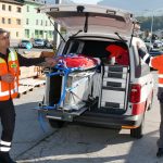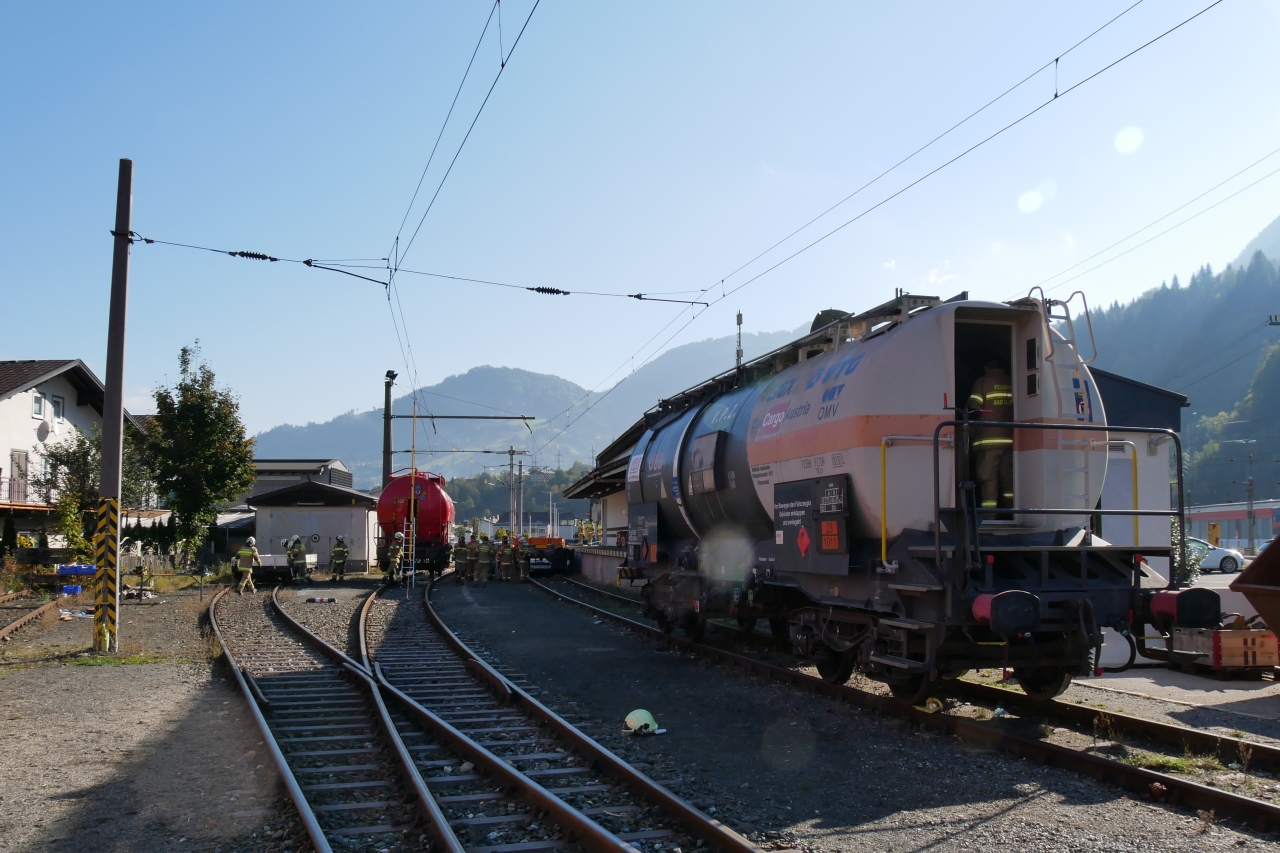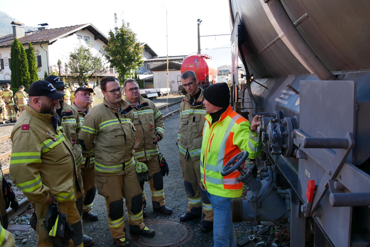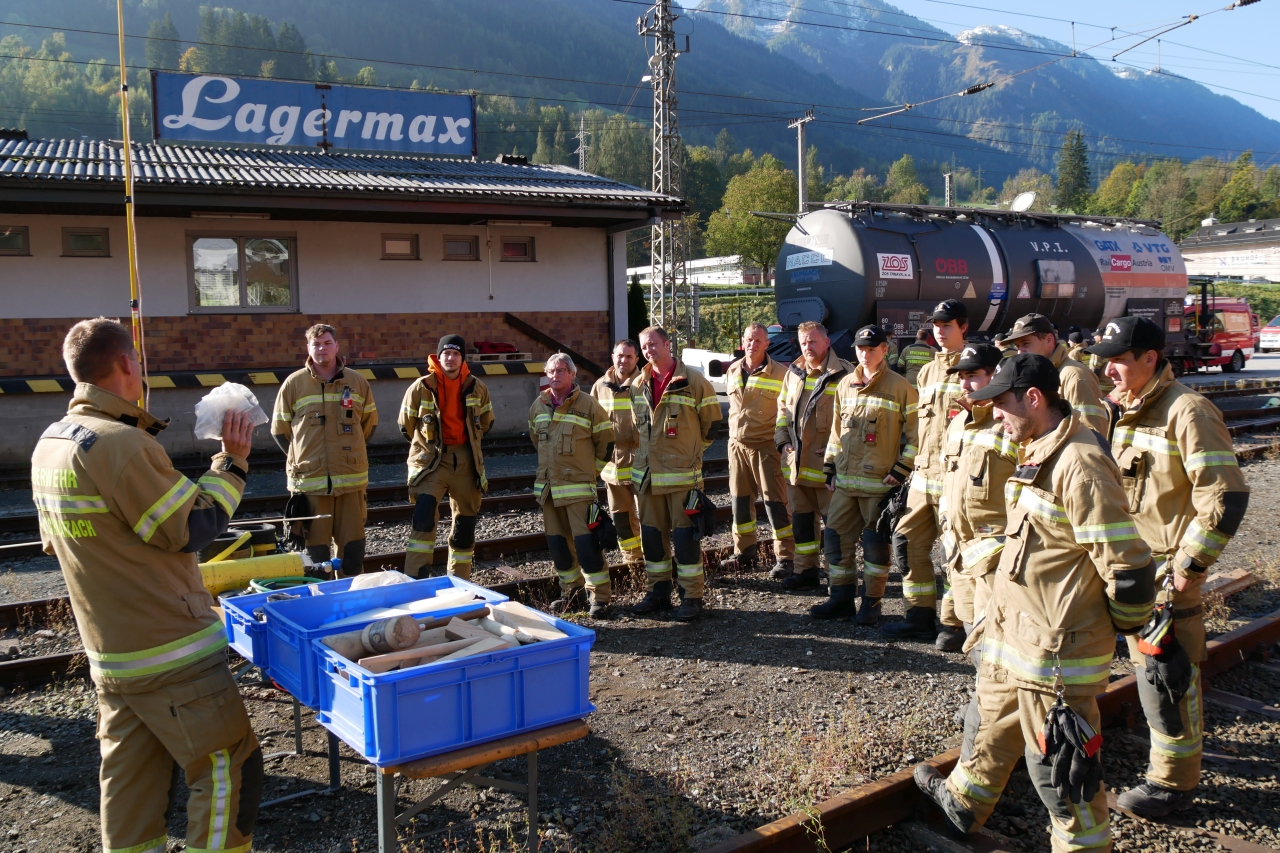Im Anschluss wurde ein praktischer Teil im Stationsbetrieb am Bahnhofsgelände abgehalten. Dabei wurden unter anderem der Ablauf beim Freischalten und Erden der Oberleitung von Mitarbeitern der ÖBB demonstriert und das Abdichten eines leckgeschlagenen Kesselwaggons in verschiedenen Varianten geübt. Aber auch Themen wie die unterschiedlichen Ventil- und Kupplungssysteme von Kesselwaggons, die Ausstattung des ÖBB-Einsatzleitfahrzeugs und der praktische Umgang damit waren Teil der Schulung.