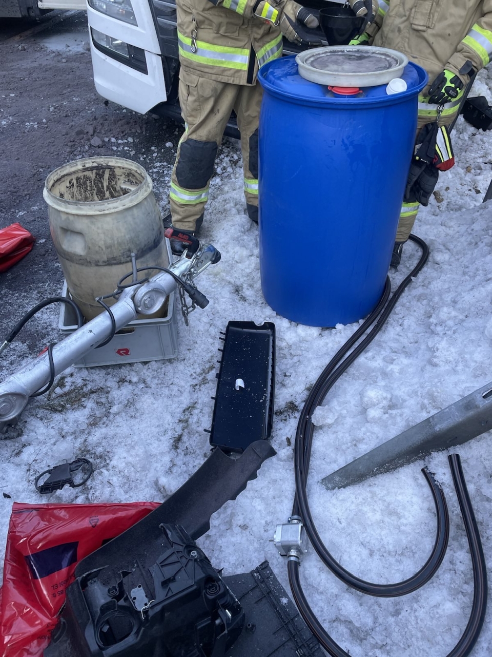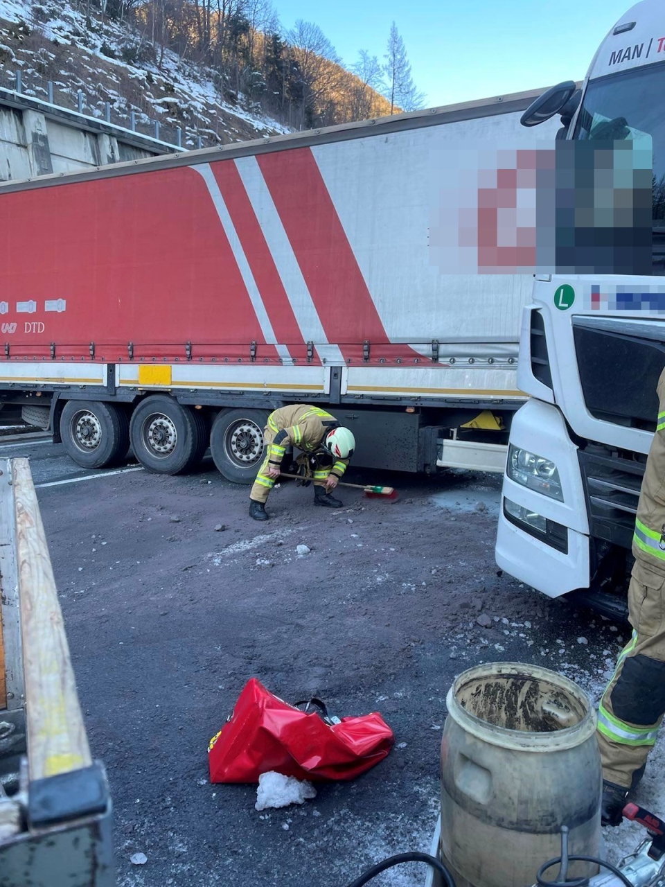 Jedoch trat aus dem beschädigten Kraftstofftank der Zugmaschine eine große Menge Diesel aus. Die Feuerwehren konnten in einem materialintensiven Einsatz noch über 100 Liter Kraftstoff auffangen und umpumpen, eine unbekannte Menge war allerdings bereits ausgetreten. Die Umweltbehörde wurde entsprechend informiert.