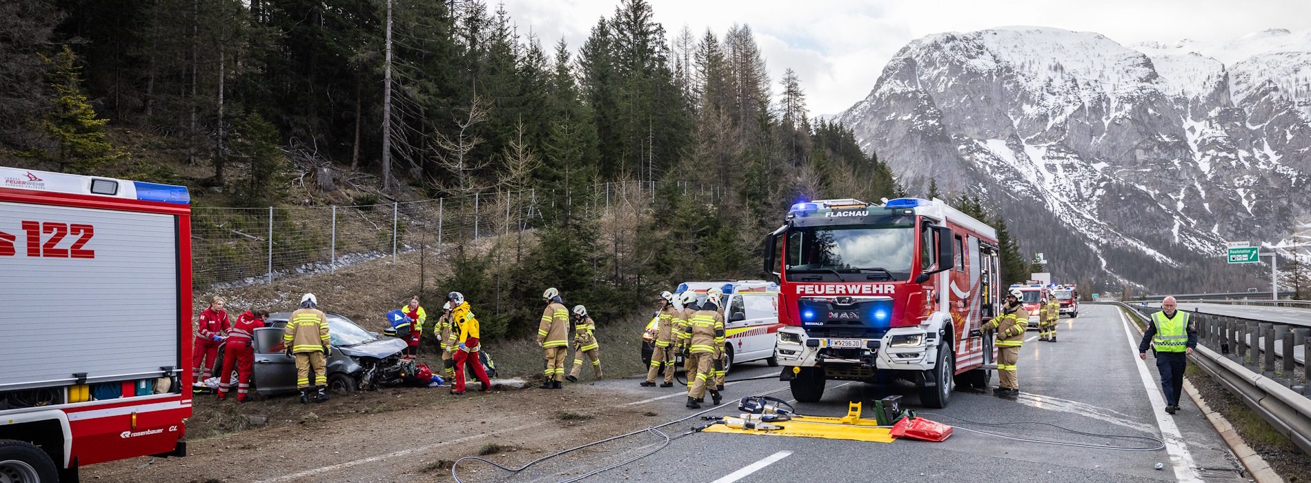 Die Freiwillige Feuerwehr Flachau-Reitdorf wurde um am Ostersonntag zu einem schweren Verkehrsunfall auf die Tauernautobahn gerufen. Der Unfall ereignete sich ca. um 07:20 auf der Fahrspur in Richtung Salzburg bei Kilometer 78,9 kurz nach dem Tauerntunnel. Die FF Flachau-Reitdorf rückte mit Voraus-, Rüstlösch-, Tanklösch- und Pumpenfahrzeug mit insgesamt 28 Mann zum Einsatz aus.