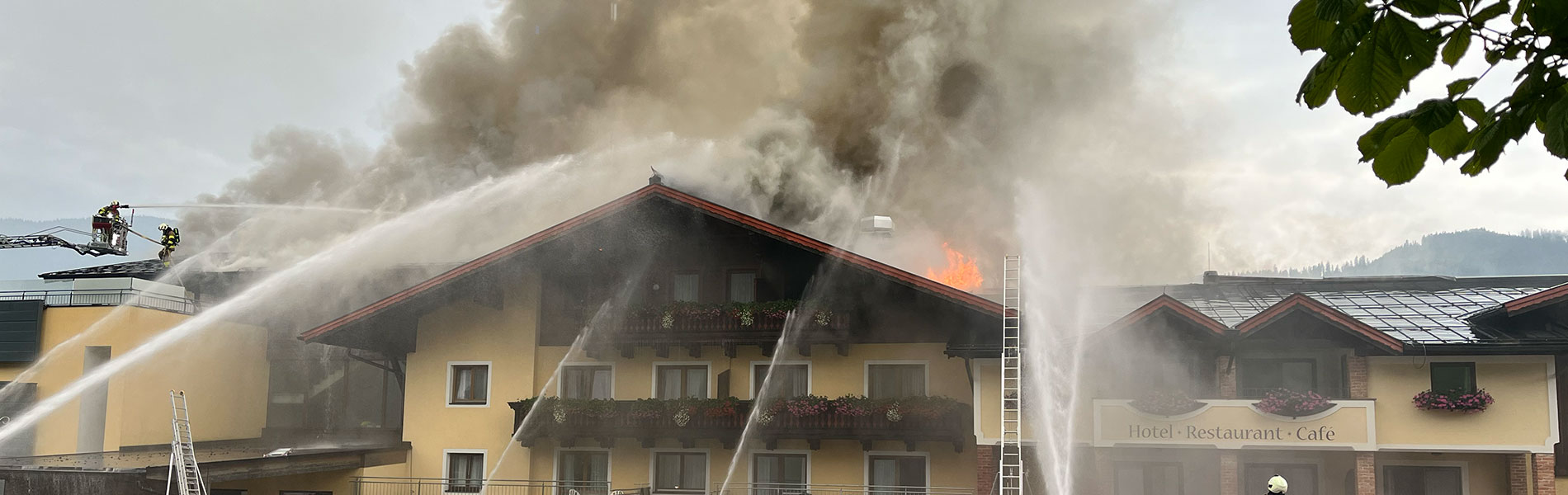 Das Feuer brach im Dachgeschoß aus uns breitete sich innerhalb kurzer Zeit auf einen Großteil des Dachstuhls aus. Durch den Einsatzleiter OBI Florian Vierthaler wurde unmittelbar nach Eintreffen am Einsatzort die Alarmstufe erhöht, so dass weitere Kräfte der Feuerwehr aus Altenmarkt im Pongau, Bischofshofen, Flachau, St. Johann im Pongau sowie St. Martin i. Tgb. alarmiert wurden. Durch den massiven Löschangriff konnte ein Übergreifen der Flammen auf einen dritten Gebäudeteil erfolgreich verhindert werden.