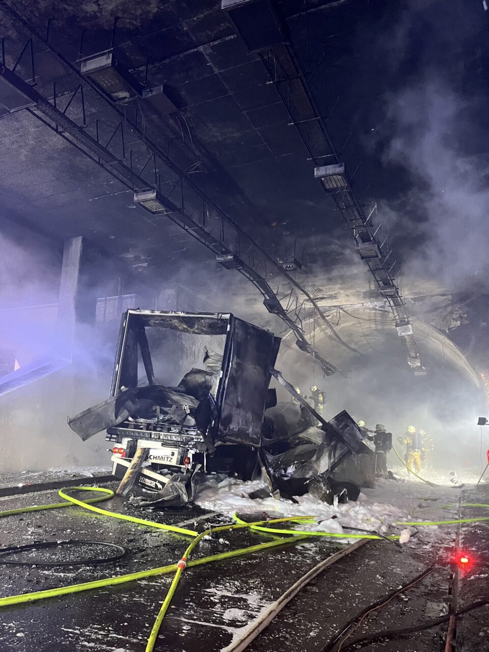 Der Lenker konnte sich selbständig aus dem Führerhaus befreien und flüchtete in die Tunnelröhre. Nach rund 50 Metern brach die Person zusammen. Die eintreffenden Einsatzkräfte der Feuerwehr konnten den Fahrer rasch lokalisieren, über eine Querverbindung aus dem Tunnel retten und dem Roten Kreuz zur weiteren medizinischen Versorgung an das Rote Kreuz übergeben. Zur Schwere der Verletzungen liegen der Feuerwehr keine Informationen vor.