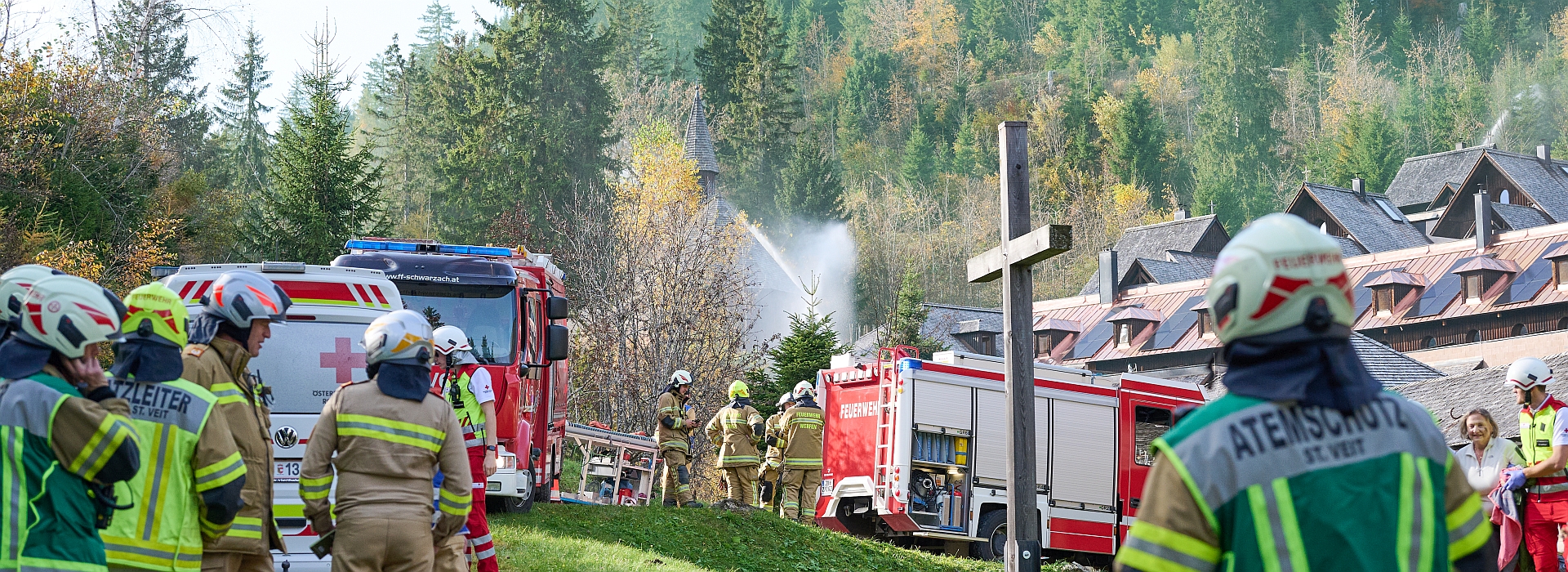 Eine großangelegte Alarmübung der Pongauer Feuerwehren fand am Samstag auf der Kinderalm in St. Veit statt. Angenommen wurde der Brand einer Klosterzelle im Kloster Maria im Paradies, der sich durch die steile Hanglage auf eine darüberliegende Zelle und schließlich auch auf den angrenzenden Wald ausbreitete. An der aufwendig inszenierten Übung, die von der Feuerwehr St. Veit organisiert und geleitet wurde, waren sämtliche Feuerwehren des Abschnitts 2 Pongau (Salzachtal), das Rote Kreuz und die Polizei mit insgesamt 182 Einsatzkräften und 33 Fahrzeugen beteiligt. Geschminkte Statisten der Theatergruppe St. Veit und der umfangreiche Einsatz von Kunstnebel trugen wesentlich zur realistischen Gestaltung bei.